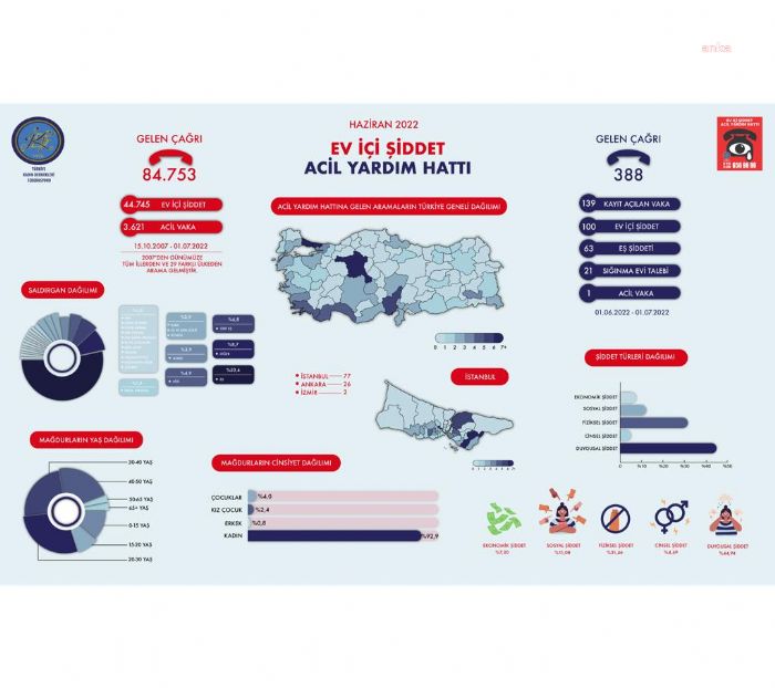TKDF tarafından hazırlanan “Ev İçi Şiddet Acil Yardım Hattı” Haziran 2022 raporu yayınlandı. Rapora göre haziran ayında yardım hattına  toplam 388 çağrı ulaştı. 37 farklı ilden gelen çağrıların 77`si İstanbul`dan, 26`sı Ankara`dan, 8`i ise Adana`dan iletildi. Ayrıca 34 farklı şehirden çağrılar geldiği belirtilen raporda diğer iller şöyle sıralandı: