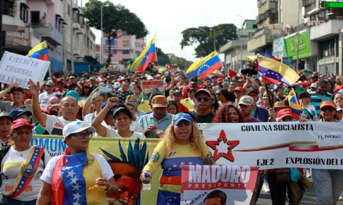 Kalabalık sık sık “Maduro dayan, halk ayaklanıyor” sloganları attı; “Başkanı kaçırdılar ama devrimi asla”, “Maduro halktır” ve “Hepimiz birer Maduro’yuz” yazılı dövizler taşıdı.