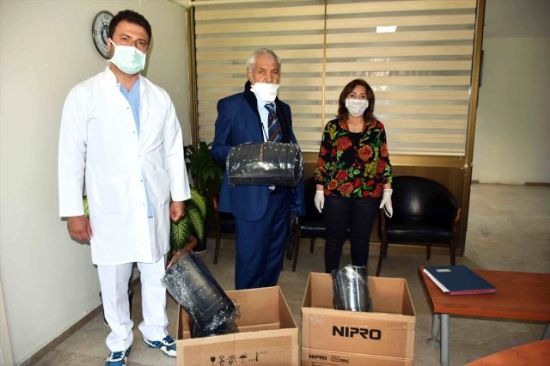 Şahin burada Başhekim Emre Direk'e 100 adet yüz koruyucu siperlik teslim etti.