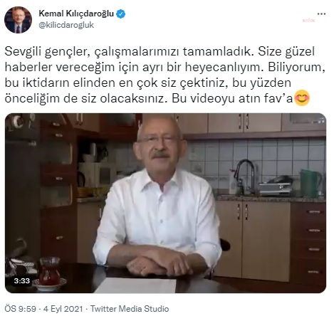 “Evet sevgili gençler, merhaba. Uzun zamandır sizi evime misafir edemedim ama sakın unuttuğumu sanmayın. Arkadaşlarımla sizin dertlerinize çalışırken maalesef bu iktidarın ülkenin başına daha büyük belalar getirmesini önlemek için sığınmacı konusuna da odaklanmak zorunda kaldım. İnanın, bunların felaketleri bitmiyor. İktidarı seçimle devralmamıza az zaman kaldı. Ortada bir enkaz var. Biz bu enkazı da toparlarız. Problemlerin daha da büyümelerini önlemek zorunda kalıyoruz. Onun için sizin dertleriniz haricinde başka meselelere de odaklanmak zorunda kaldım. Neyse, buradayız. Her şey güzel. Çayımız lezzetli ve ilk müjdelerimizi vermeye hazırım. Az sonra, iktidara geldiğimiz ilk altı ayda yapacaklarımızı sizlerle paylaşacağım. Bakın bu anlatacaklarım, gençlik için ilk altı ayda yapacaklarım. Yoksa liste çok uzun. Haydi başlıyorum gençler. İsteyen bu videoyu indirebilir. Ya da atın fava. Bunlar, size ilk altı aydaki vaatlerimdir.