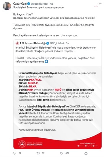 "Suç İçişleri Bakanımız yeni kumpas peşinde. Bu kaçıncı iftira? Boğaziçi öğrencilerine attkların yetmedi sıra İBB çalışanlarına mı geldi? Türkiye'de 160 PKK'lı kaldı diyordun, şimdi 455 PKK'lı İBB'de çalışıyor diyorsun... Kendi açıklaman seni yalanlıyor ama sen utanmıyorsun."