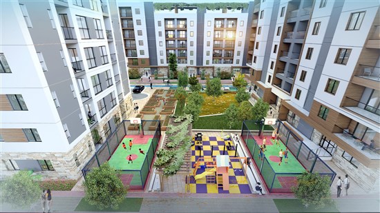 415 konut, 45 işyeri, kültür merkezi, cami, kreş ve spor alanları