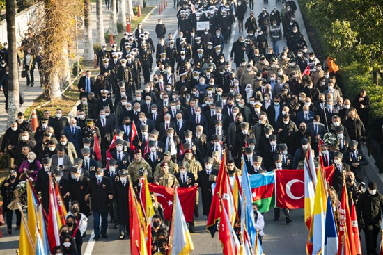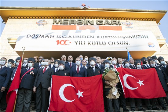Mersin Büyükşehir Belediyesi Halk Oyunları Ekibi’nin gösterisi ile Mersin Tren Garı’ndan başlayan törende, trenle istasyona gelen muharip gazilerden oluşan temsili heyet karşılandı.Karşılamanın ardından Tren Garı’ndan Cumhuriyet Meydanı’na kadar Mersin Büyükşehir Belediye Bandosu eşliğinde yürüyüş yapıldı.