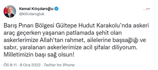 CHP Genel Başkanı Kemal Kılıçdaroğlu, “Barış Pınarı Bölgesi Gültepe Hudut Karakolu’nda askeri araç geçerken yaşanan patlamada şehit olan askerlerimize Allah’tan rahmet, ailelerine başsağlığı ve sabır, yaralanan askerlerimize acil şifalar diliyorum. Milletimizin başı sağ olsun” mesajını paylaştı.