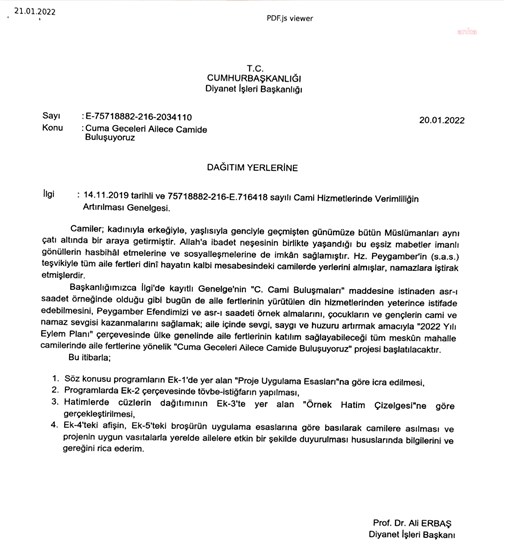 Ası-ı saadet örneğinde olduğu gibi bugün de aile fertlerinin yürütülen din hizmetlerinden yeterince istifade edebilmesini, Peygamber Efendimizi ve asr-ı saadeti örnek almalarını, çocukların ve gençlerin cami ve namaz sevgisini kazanmalarını sağlamak; aile içi sevgi, saygı ve huzuru artırmak amacıyla ülke genelinde aile fertlerinin katılım sağlayabileceği tüm meskun mahalle camilerinde aile fertlerine yönelik 'Cuma Geceleri Ailece Camide Buluşuyoruz' projesi başlatılacaktır."