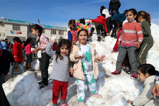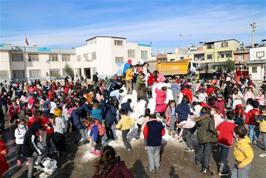 Okullarının bahçesindeki kardan dağa tırmanan minikler, gönüllerince eğlenip güzel bir vakit geçirdi, birbirlerine kartopu fırlattı. Çocuklarının kar eğlencesine kimi veliler de ortak oldu. Birçok veli, çocuklarının kar eğlencesini cep telefonları ile çekerken, hayatında ilk kez kar gören yaşlı bir kadın, karın tadına baktı. Öğrenciler, öğretmen ve veliler, sürpriz için Akdeniz Belediye Başkanı M. Mustafa Gültak’a teşekkür ettiler.