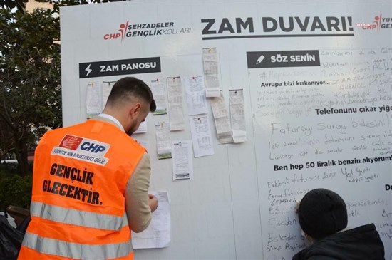 CHP Manisa Gençlik Kolları şehir merkezindeki meydanda ‘Zam Duvarı’ oluşturdu. Manisalı vatandaşların faturalarını iliştirdiği zam duvarına CHP Grup Başkanvekili Özgür Özel, “Hemen seçim!... Halk kazanacak, Saray kaybedecek!!!..Ampül sönecek acılar geççek” yazdı.