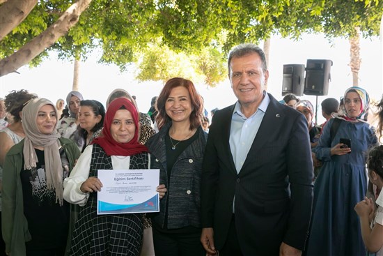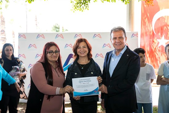 Mersin Büyükşehir Belediyesi’nin kadınların evdeki gizli iş gücünü açığa çıkarmak, ekonomik olarak onlara katkı sunmak ve sosyalleşmelerine destek sağlamak amacıyla Mersinden Kadın Kooperatifi’yle hayata geçirdiği Evimiz Atölye Projesi, her geçen gün büyüyerek daha çok kadına ulaşıyor. Proje kapsamında eğitimlerini tamamlayan Gündoğdu Mahallesi’ndeki kadınlara sertifikalarını Büyükşehir Belediye Başkanı Vahap Seçer ve Mersinden Kadın Kooperatifi Başkanı Meral Seçer verdi.Kadınlara her zaman destek olacaklarını söyleyen Başkan Seçer,“Mersin Büyükşehir Belediyesi vatandaşın evidir. Belediye Başkanı vatandaşın kardeşidir” dedi.