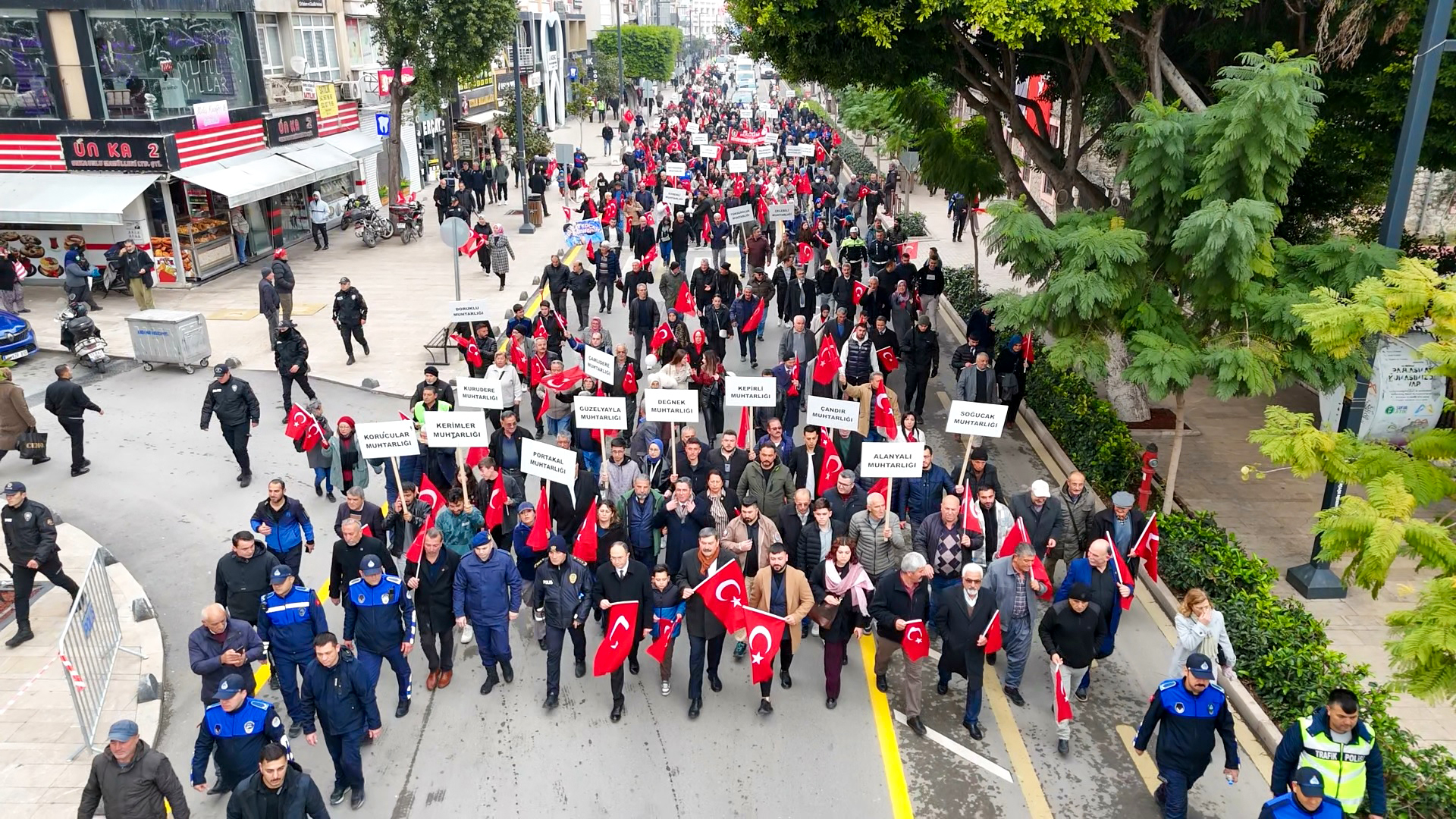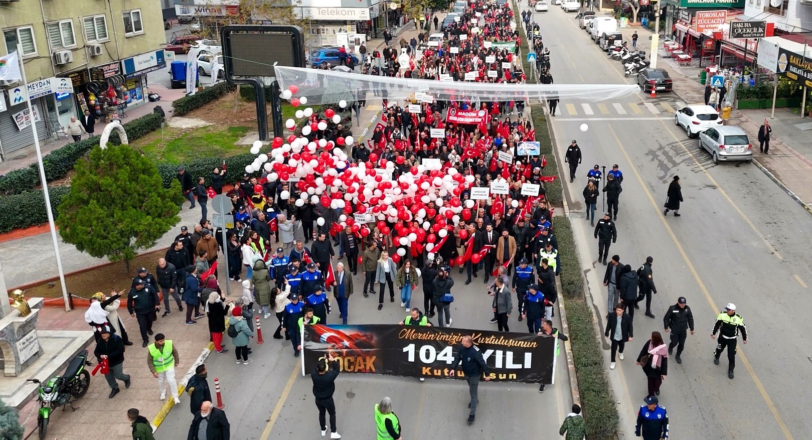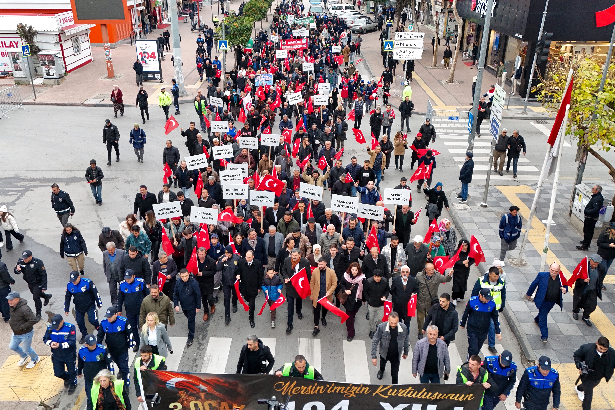 Balkonlardan ve iş yerlerinden bayraklarıyla destek veren Mersinliler, kurtuluş coşkusuna ortak oldu. Yürüyüş boyunca birlik ve beraberlik mesajı verildi.