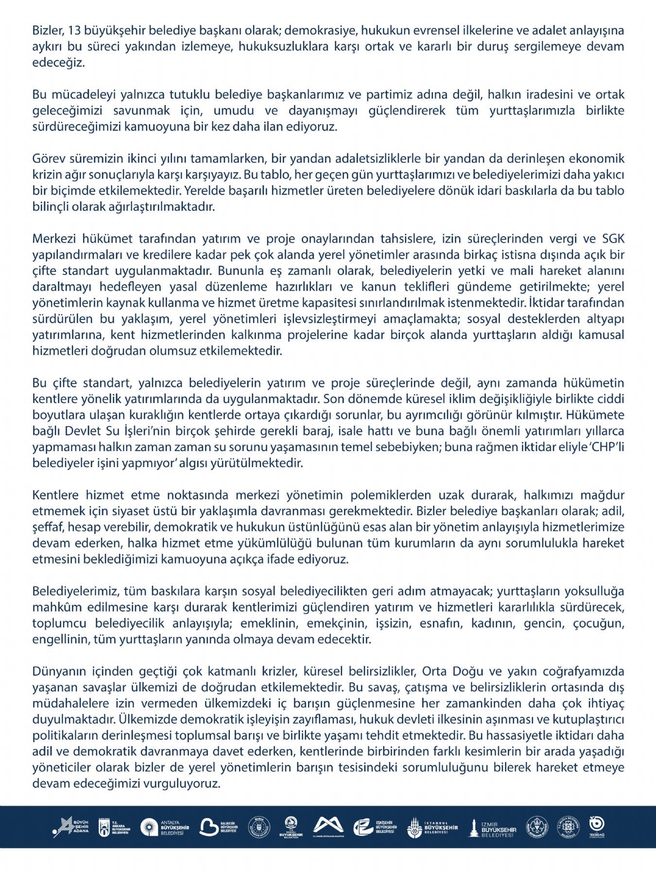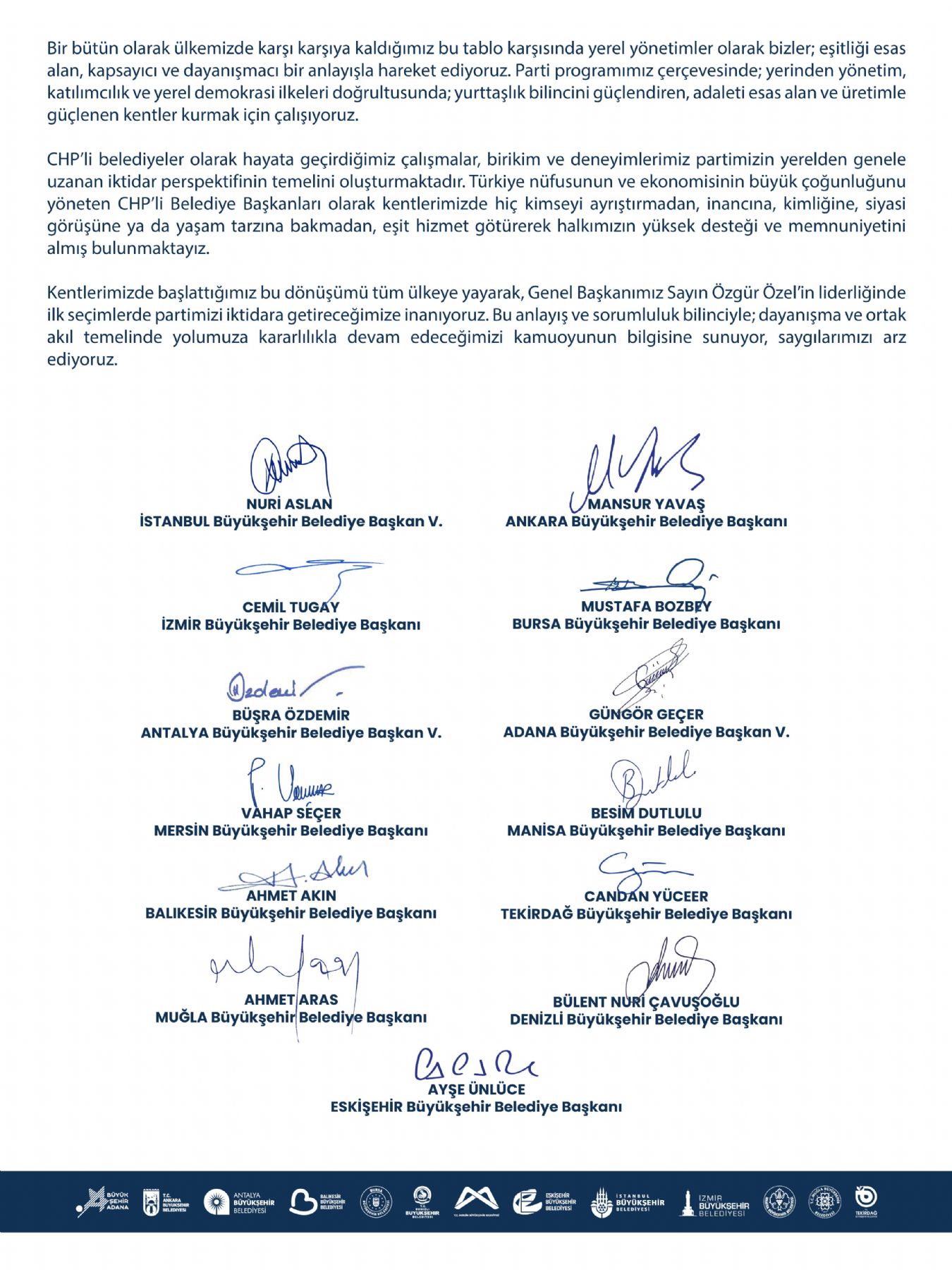 Başkanlar, iktidarın yerel yönetimleri işlevsizleştirmeyi amaçlayan uygulamalarına karşı ortak duruş sergileyeceklerini, halkın iradesini ve demokratik değerleri savunmaya devam edeceklerini ifade etti. Bildirgede ayrıca, CHP’li belediyelerin toplumcu belediyecilik anlayışıyla yurttaşların yanında olmaya devam edeceği ve ilk seçimlerde partiyi iktidara taşıma kararlılığı dile getirildi.