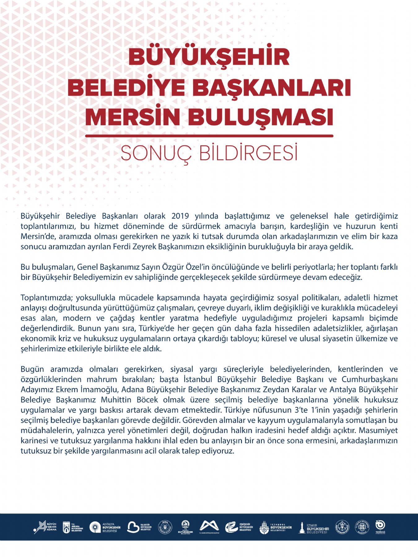 (MERSİN) – Mersin Büyükşehir Belediye Başkanı ve Türkiye Belediyeler Birliği Başkan Vekili Vahap Seçer, CHP’li büyükşehir belediye başkanları toplantısının sonuç bildirgesini kamuoyuna açıkladı.