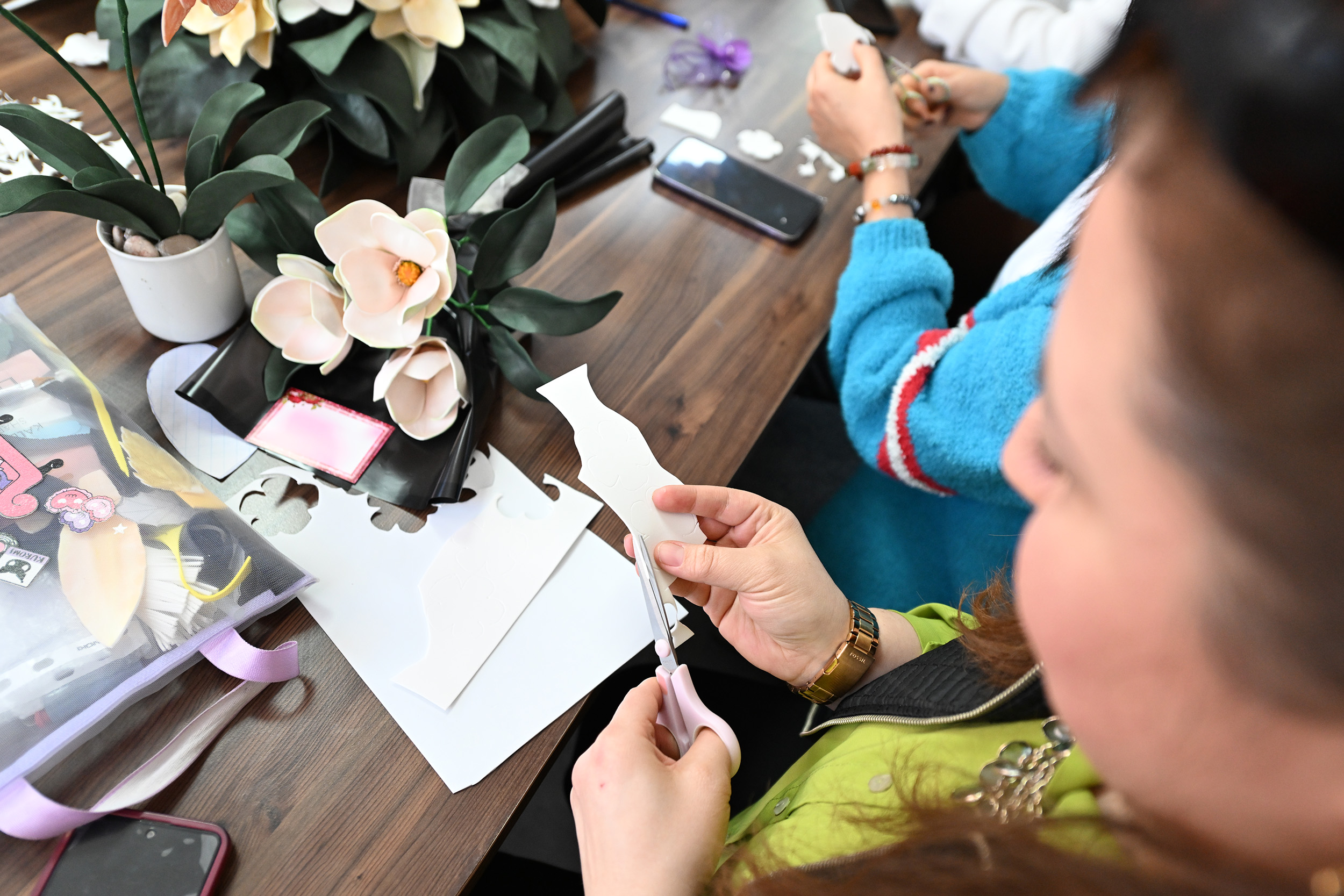 Turgutreis MERCEK’te devam eden kurslarda, uzman eğitmenler eşliğinde eva kağıtları ve çeşitli materyaller hayat buluyor. Gelin çiçeklerinden ev dekorasyonuna, vitrin süslemelerinden dev organizasyon panolarına kadar geniş bir yelpazede üretim yapan kadınlar, profesyonel ekipmanlarla donatılıyor.