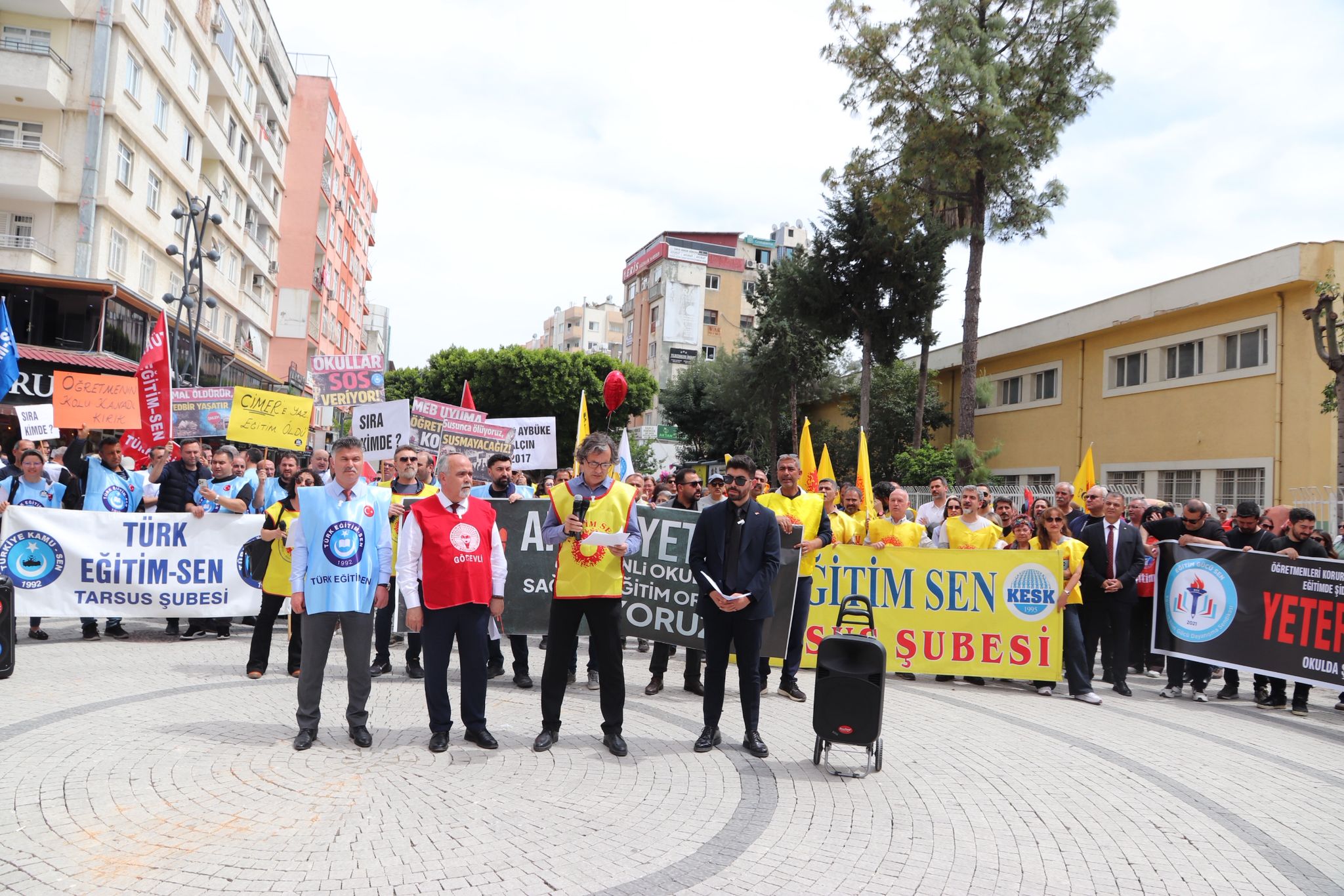 Tarsus Yarenlik Alanı, eğitim emekçilerine yönelik artan şiddet olaylarına karşı tarihi bir protestoya ev sahipliği yaptı. Türk Eğitim-Sen, Eğitim-Sen, Eğitim-İş ve Eğitim Gücü-Sen’in ortak çağrısıyla bir araya gelen yüzlerce öğretmen, "Okullar güvenli olana dek mücadele sürecek" mesajı verdi. Eyleme destek veren CHP Parti Meclisi Üyesi Ozan Varal, okulların savaş alanına dönmesine izin vermeyeceklerini vurguladı.