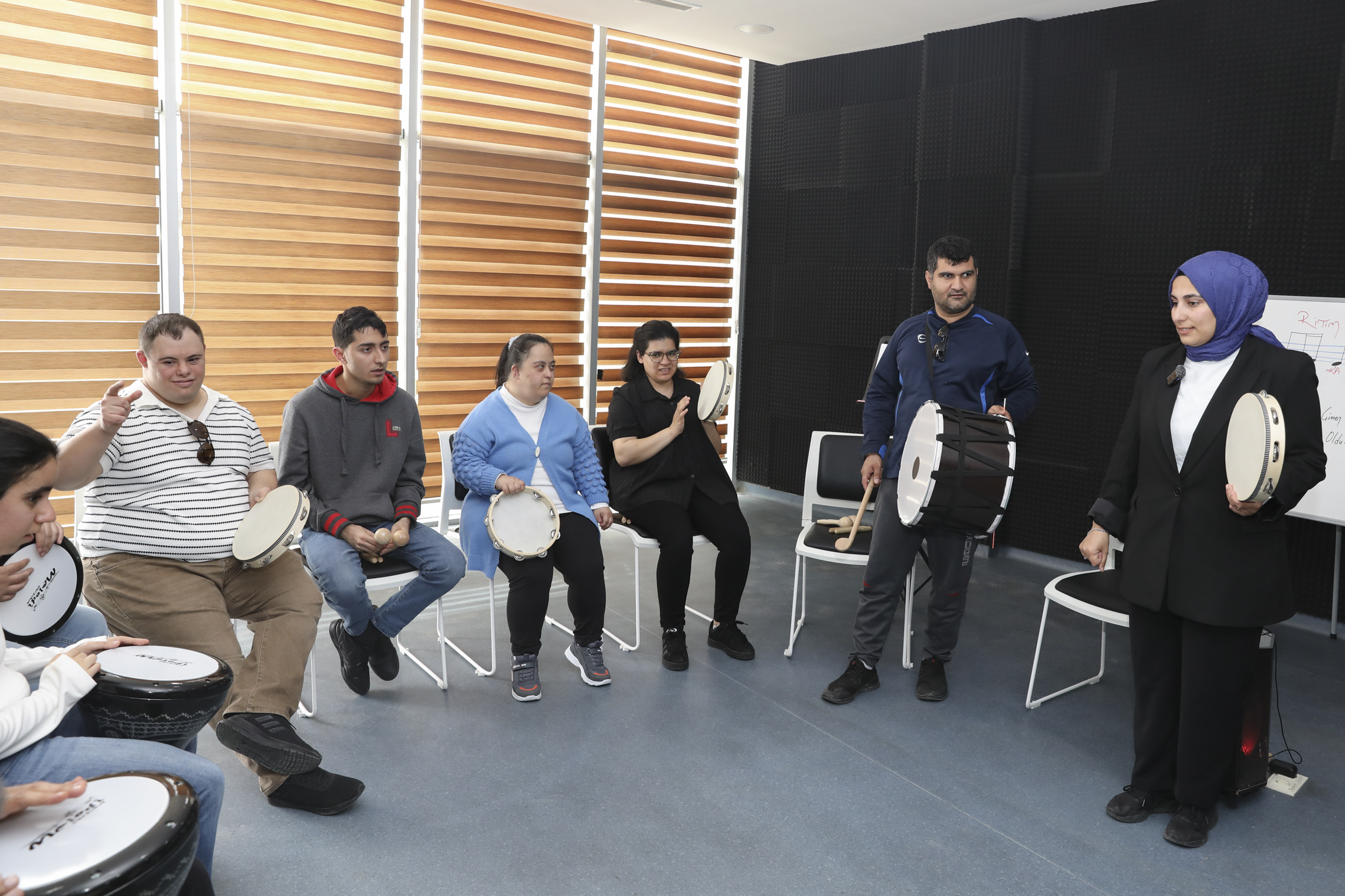 Atölyenin en keyifli anları ise şüphesiz uygulama aşaması. Özel gereksinimli bireyler, öğrendikleri ritimlerle Türk müziğinin sevilen eserlerini icra ediyor.