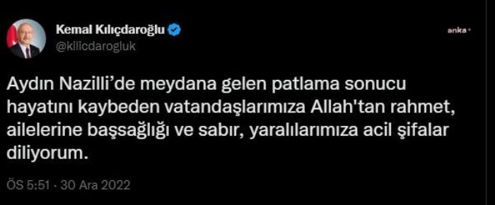 CHP Genel Başkanı Kemal Kılıçdaroğlu, Aydın`ın Nazilli ilçesinde 7 kişinin yaşamını yitirdiği patlamaya ilişkin “Aydın Nazilli`de meydana gelen patlama sonucu h...