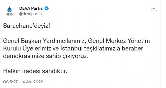 Demorkasi ve Atılım (DEVA) Partisi, İstanbul Büyükşehir Belediye Başkanı Ekrem İmamoğlu`nun Saraçhane çağrısı sonrası; “Saraçhane`deyiz! Genel Başkan Yardımcıla...