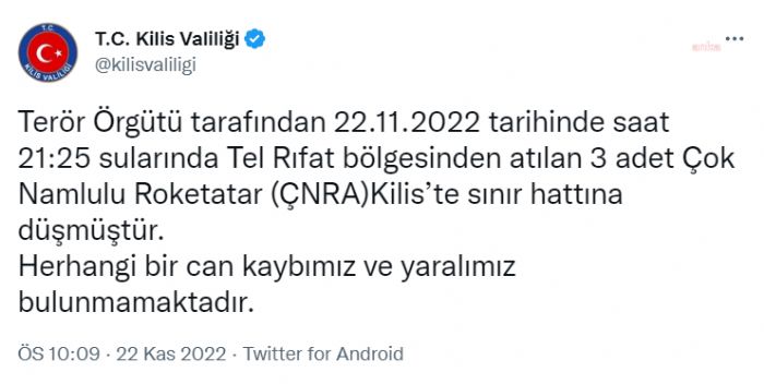 Kilis Valiliği, “Terör Örgütü tarafından saat 21.25 sularında Tel Rıfat bölgesinden atılan 3 adet Çok Namlulu Roketatar (ÇNRA) Kilis`te sınır hattına düşmüştür....