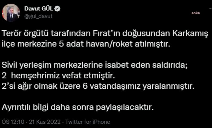 Gaziantep Valisi Gül, “Terör örgütü tarafından Fırat`ın doğusundan Karkamış merkezine 5 adet havan/roket atılmıştır. Saldırıda; 2 hemşehrimiz vefat etmiştir. 2`...
