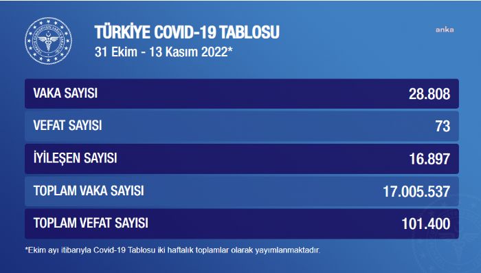 Sağlık Bakanlığı`nın 31 Ekim-13 Kasım 2022 tarihlerine ilişkin koronavirüs verilerine göre; yedi gün içerisinde 28 bin 808 kişi pozitif çıktı, 16 bin 897 kişi i...