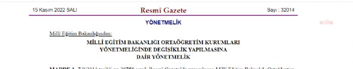 Milli Eğitim Bakanlığı`nın Ortaöğretim Kurumları Yönetmeliği`nde yaptığı değişiklikle; ‘siyasi ve ideolojik araç gereç dağıtmak`, “okul yöneticisi, öğretmen ve ...