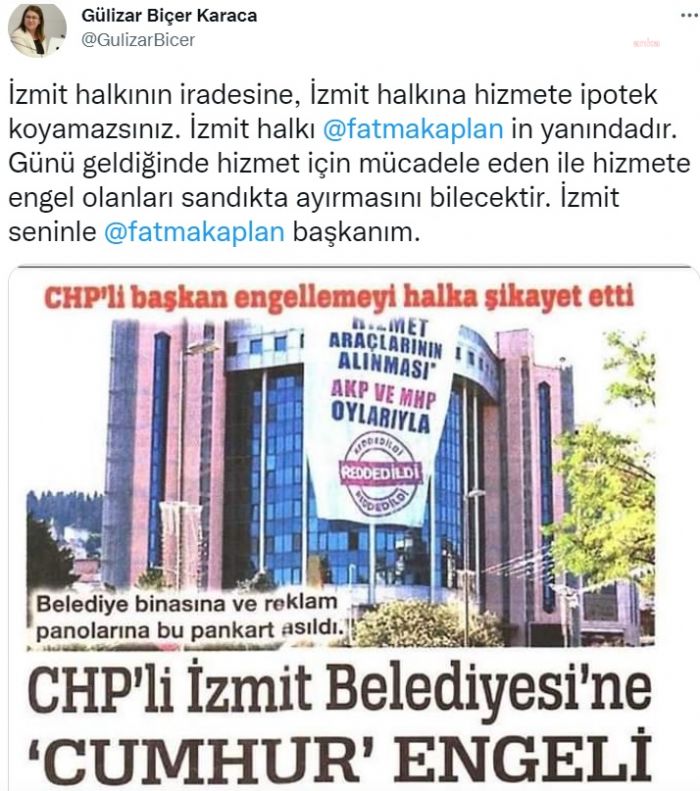 CHP Genel Başkan Yardımcısı Gülizar Biçer Karaca, araç satın alma talebi Belediye Meclisi`nde Cumhur İttifakı üyelerinin oyları ile reddedilen İzmit Belediye Ba...