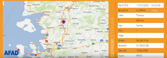 Afet ve Acil Durum Yönetimi Başkanlığı (AFAD), Manisa`nın Soma İlçesi`nde 4.3 büyüklüğünde deprem olduğunu duyurdu....