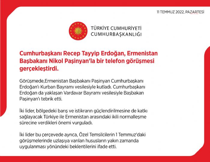 Cumhurbaşkanı Recep Tayyip Erdoğan, bugün Ermenistan Başbakanı Nikol Paşinyan ile telefonda konuştu. Cumhurbaşkanlığı görüşmeye ilişkin, “İki lider, bölgedeki b...
