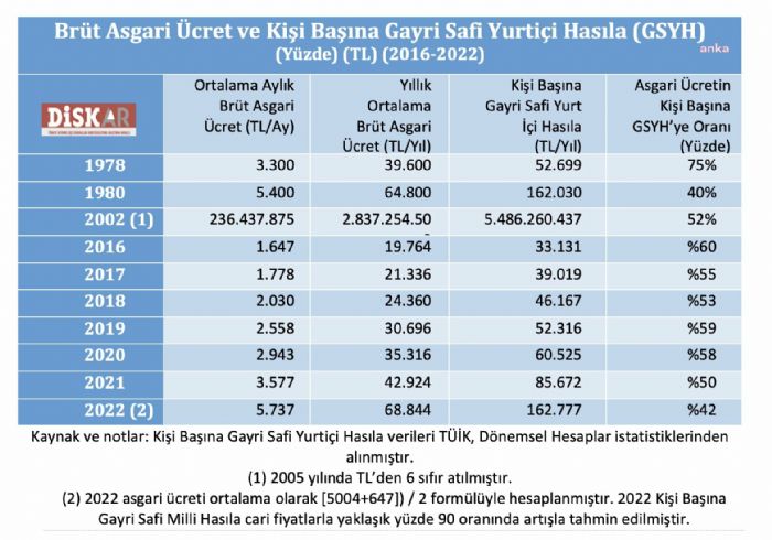 Devrimci İşçi Sendikaları Konfederasyonu Araştırma Merkezi`nin (DİSK-AR) verilerine göre, asgari ücretin kişi başına gayri safi yurtiçi hasılaya (GSYH) oranı yü...