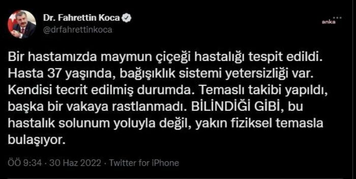 Sağlık Bakanı Dr. Fahrettin Koca, "Bir hastamızda maymun çiçeği hastalığı tespit edildi. Hasta 37 yaşında, bağışıklık sistemi yetersizliği var. Kendisi tecrit e...