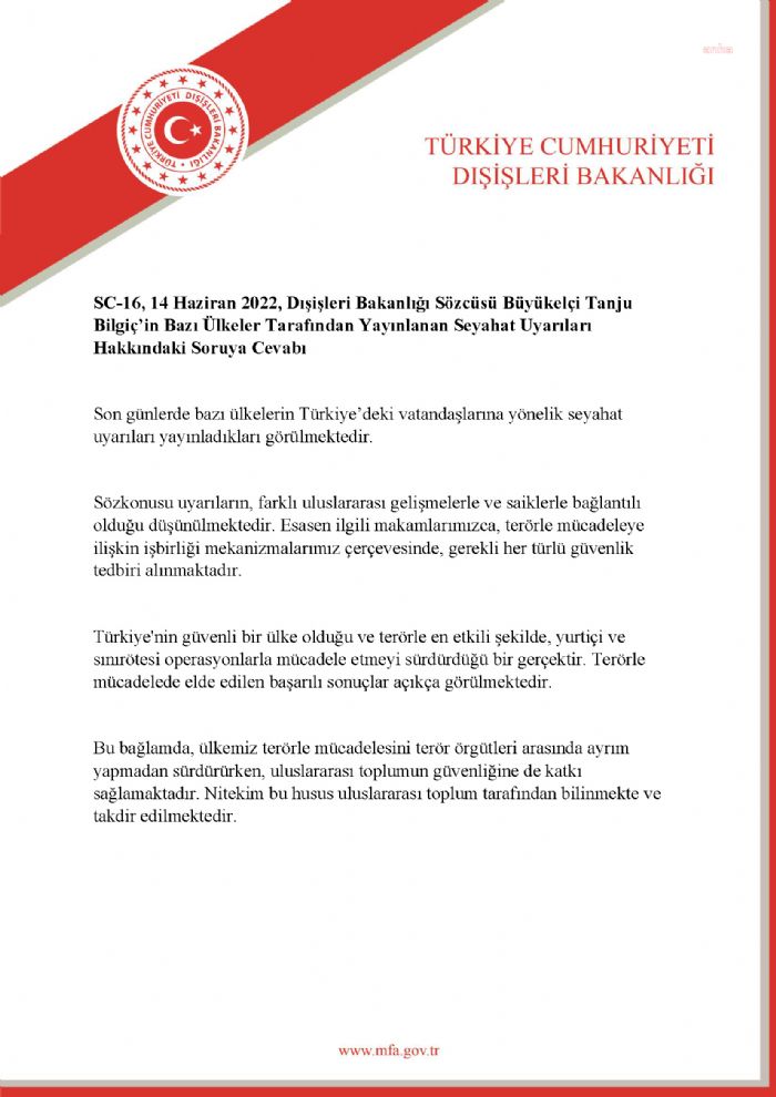 Dışişleri Bakanlığı Sözcüsü Büyükelçi Tanju Bilgiç, bazı ülkelerin seyahat uyarılarına ilişkin “Söz konusu uyarıların, farklı uluslararası gelişmelerle ve saikl...
