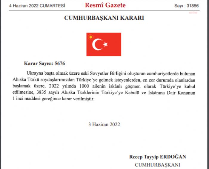 Bu yıl, Ahıska Türkü 1000 aile iskanlı göçmen olarak Türkiye`ye kabul edilecek. Konuya ilişkin Cumhurbaşkanı Kararı bugünkü Resmi Gazete`de yayınlandı....