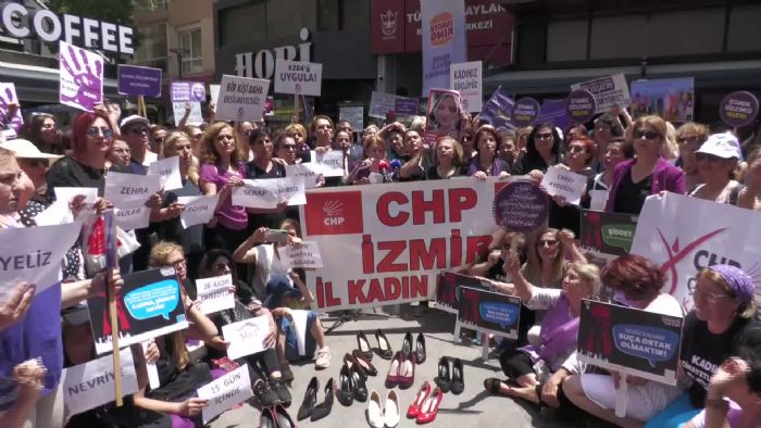 CHP İzmir İl Kadın Kolları, kadına yönelik şiddete karşı etkin önlemlerin alınmaması ve artan kadın cinayetlerine tepki göstermek için Konak`ta oturma eylemi ya...