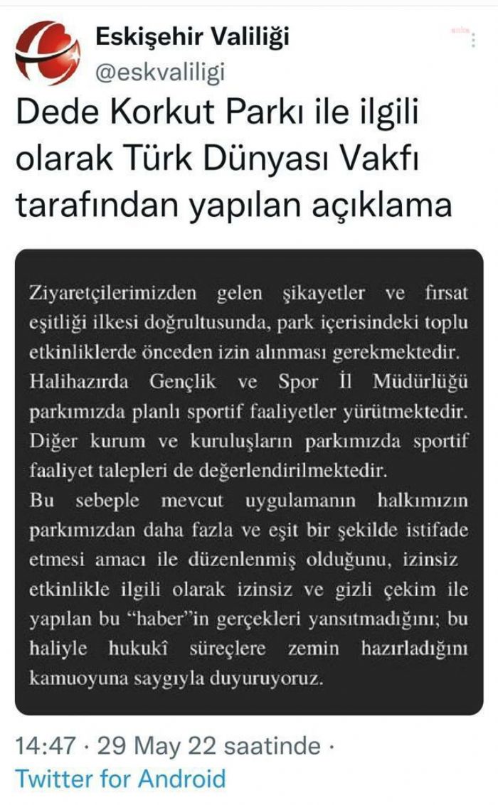 Eskişehir`de Türk Dünyası Kültür Vakfına ait olan bir parkta yoga etkinliğine yasak getirilmesinin ardından vakıf tarafından açıklama yapıldı. Açıklamada, "Ziya...
