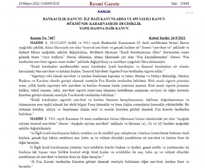 TBMM Genel Kurulu`nda önceki gün kabul edilen “Bankacılık Kanunu ile Bazı Kanunlarda ve 655 sayılı Kanun Hükmünde Kararnamede Değişiklik Yapılmasına Dair Kanun”...