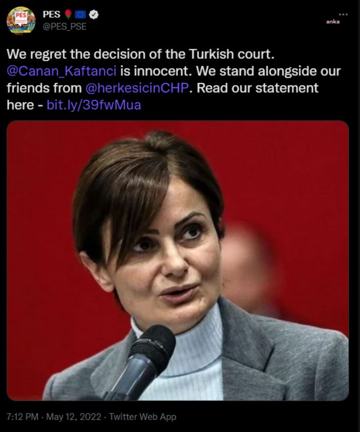 Avrupalı Sosyalistler Partisi (PES), Yargıtay`ın CHP İstanbul İl Başkanı Canan Kaftancıoğlu hakkındaki onama kararına ilişkin, “PES, hiçbir suç işlemeyen Kaftan...