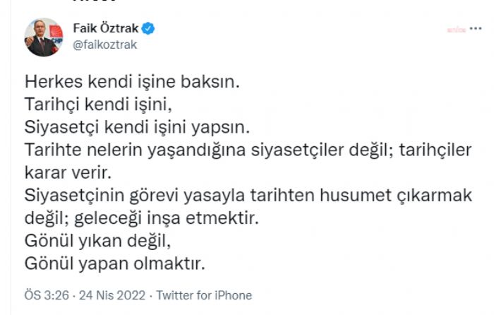 CHP Parti Sözcüsü Faik Öztrak, “Siyasetçinin görevi yasayla tarihten husumet çıkarmak değil; geleceği inşa etmektir” dedi....
