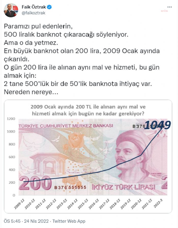 CHP Parti Sözcüsü Faik Öztrak, 500 liralık banknot basılacağı iddiaları için “En büyük banknot olan 200 lira, 2009 Ocak ayında çıkarıldı. O gün 200 lira ile alı...