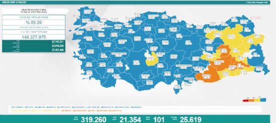 Sağlık Bakanlığı`nın 17 Mart`a ilişkin koronavirüs verilerine göre; son 24 saat içerisinde yapılan 319 bin 260 testten 21 bin 354`ü pozitif çıktı. Virüs nedeniy...