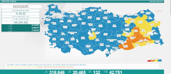 Sağlık Bakanlığı`nın 12 Mart`a ilişkin koronavirüs verilerine göre; son 24 saat içerisinde yapılan 318 bin 846 testten 20 bin 465`i pozitif çıktı. Virüs nedeniy...