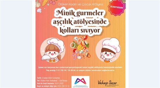 Büyükşehir Belediyesi Kadın ve Aile Hizmetleri Dairesi,minikler için Aşçılık Atölyesi açıyor. Tarsus’ta bulunan Ötüken Park Yerleşkesi’nde5 Şubat’ta başlayacak ...