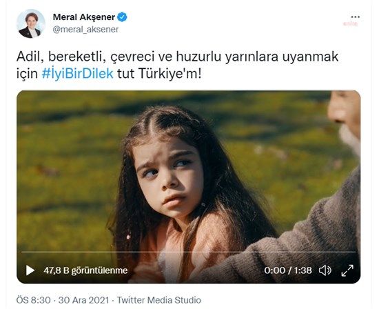 İYİ Parti Genel Başkanı Meral Akşener yeni yıl için “Adil, bereketli, çevreci ve huzurlu yarınlara uyanmak için iyi bir dilek tut Türkiye’m” mesajını paylaştı....