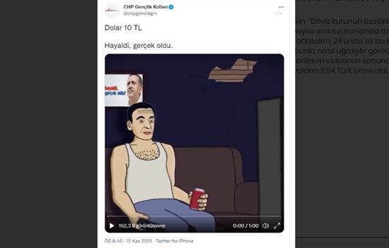 CHP Gençlik Kolları’nın "Dolar 10 TL, Hayaldi Gerçek Oldu" başlığıyla paylaştığı videoda Cumhurbaşkanı Recep Tayyip Erdoğan’ın, “Ben ekonomistim” sözlerine yer ...