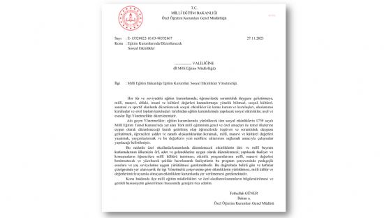 MİLLİ EĞİTİM BAKANLIĞI`NDAN ÖZEL OKULLARA “SOSYAL ETKİNLİK” TALİMATI: “ÖRF, ADET VE GELENEKLERE UYGUN DÜZENLENECEK; MİLLÎ KÜLTÜR VE DEĞERLERİMİZLE UYUMLU OLMAYAN ETKİNLİKLERE YER VERİLMEYECEK”
