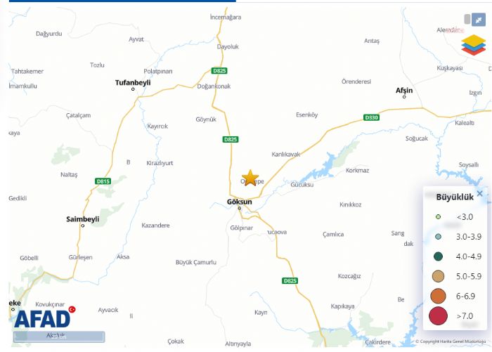 KAHRAMANMARAŞ GÖKSUN`DA 4.5 BÜYÜKLÜĞÜNDE DEPREM OLDU