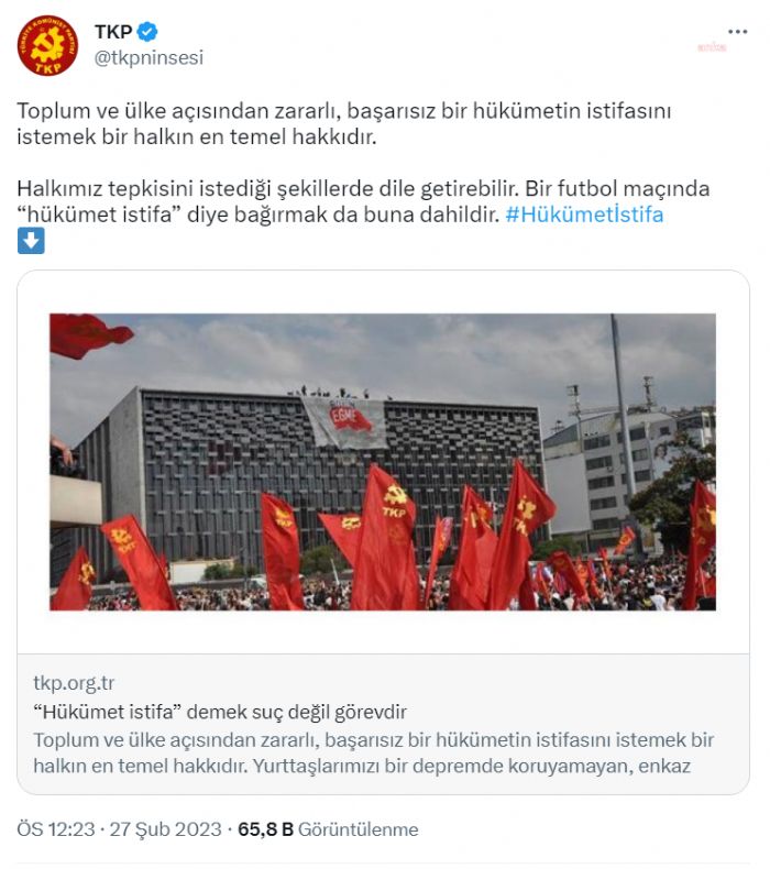 Türkiye Komünist Partisi (TKP), Fenerbahçe ve Beşiktaş taraftarlarının tribünlerden hükümeti istifaya çağırması ve Kadıköy`de Kızılay`ı protesto ederken ‘hüküme...