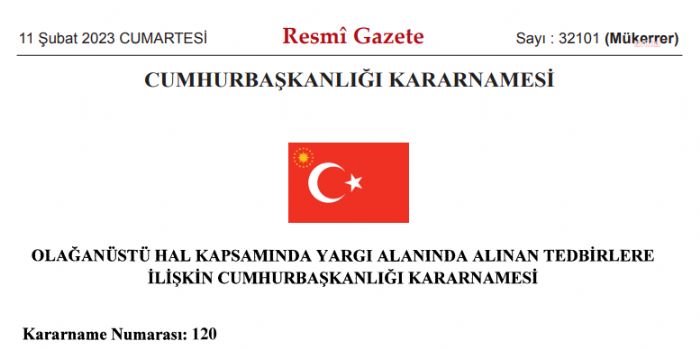 Depremden etkilenen 10 ilde, 3 ay süreyle ilan edilen OHAL kapsamında yargı alanında alınacak tedbirlere ilişkin Cumhurbaşkanlığı Kararnamesi, Resmî Gazete`de y...