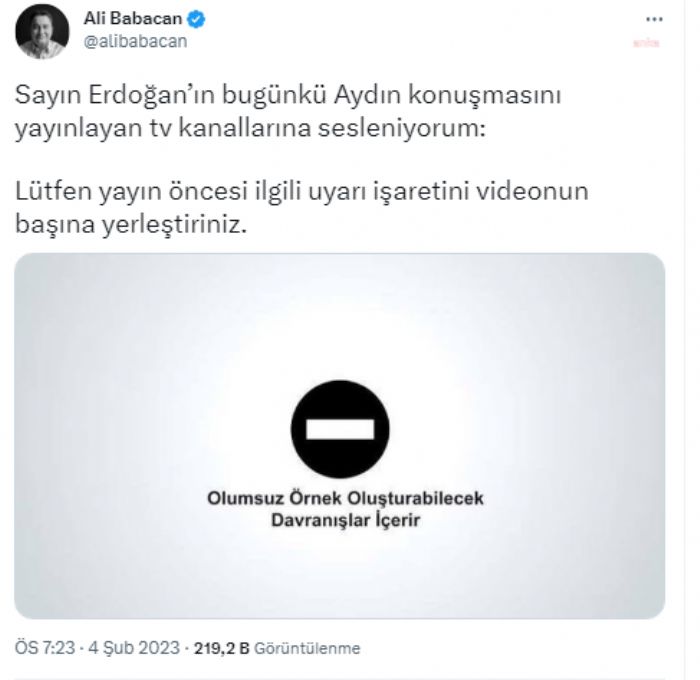 BABACAN: “SAYIN ERDOĞAN`IN BUGÜNKÜ AYDIN KONUŞMASINI YAYINLAYAN TV KANALLARINA SESLENİYORUM: LÜTFEN YAYIN ÖNCESİ İLGİLİ UYARI İŞARETİNİ VİDEONUN BAŞINA YERLEŞTİRİNİZ”